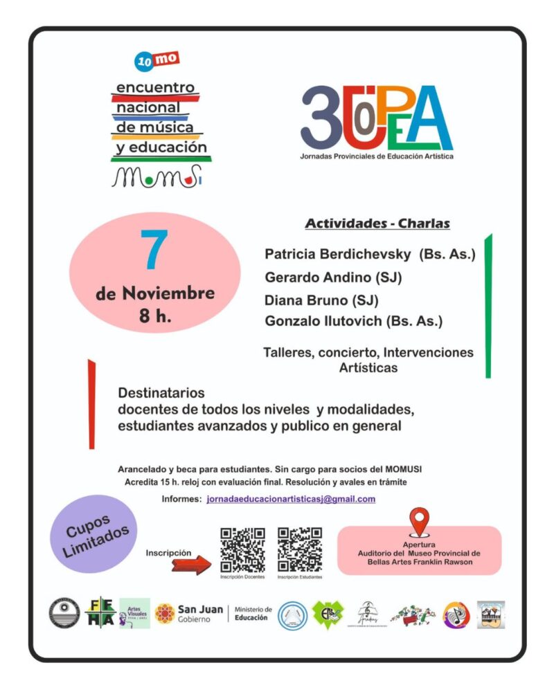 ✅ Sin cargo para estudiantes de los ISFD organizadores, socios MOMUSI, ACMuSJ y Dpto. de artes visuales y Dpto. de música de la FFHA – UNSJ